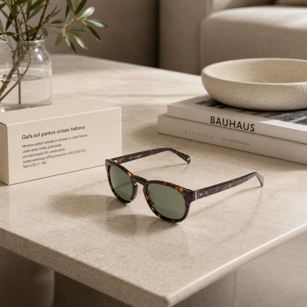 La gafa de sol pantos unisex habana de Aosa.es combina diseño clásico con tecnología avanzada para proteger la vista frente a la radiación solar y el deslumbramiento. Su montura de acetato en color habana y lentes verdes polarizadas la convierten en una opción versátil, adecuada tanto para el uso diario como para actividades al aire libre.